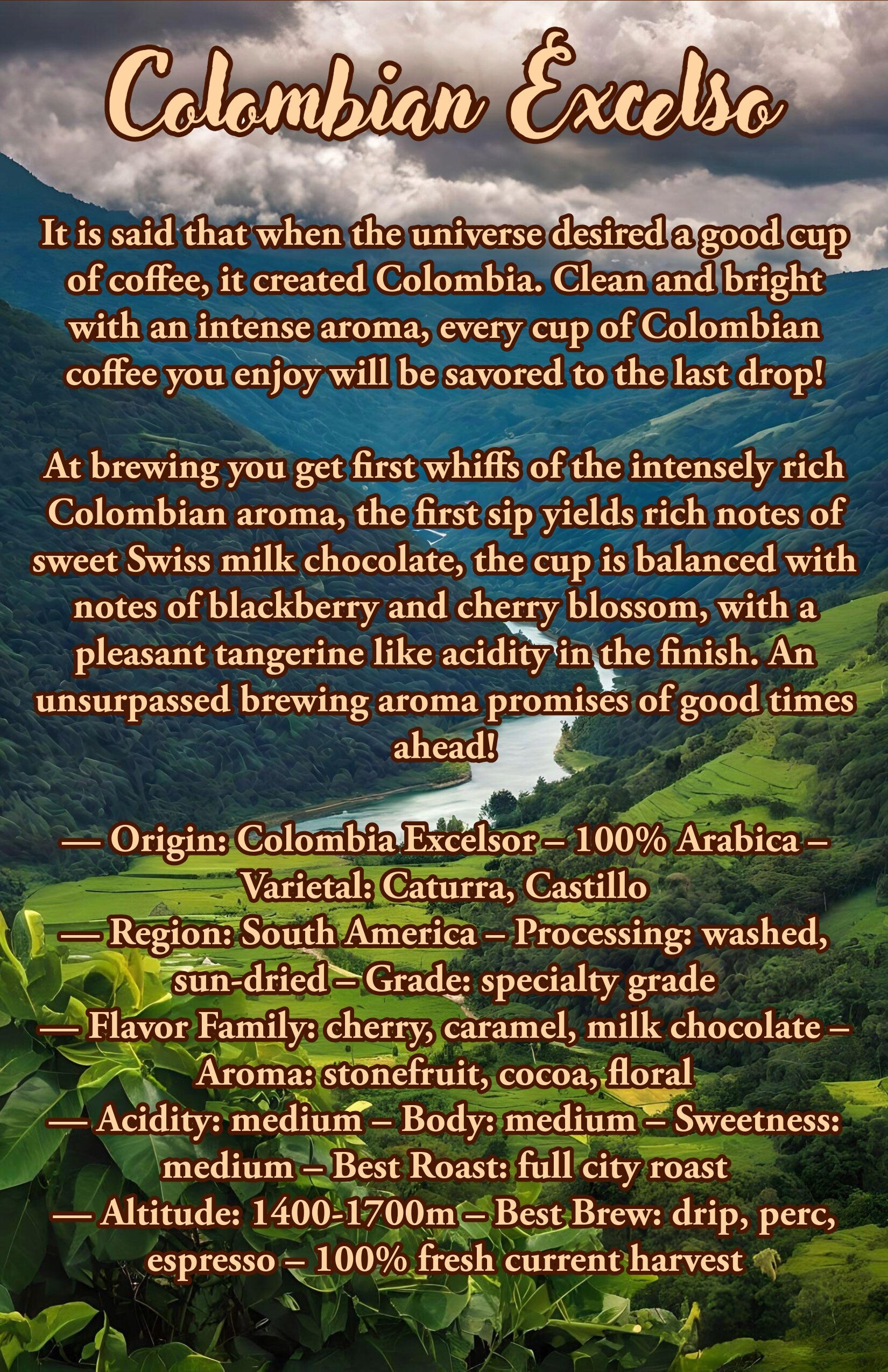— Origin: Colombia Excelsor – 100% Arabica – Varietal: Caturra, Castillo