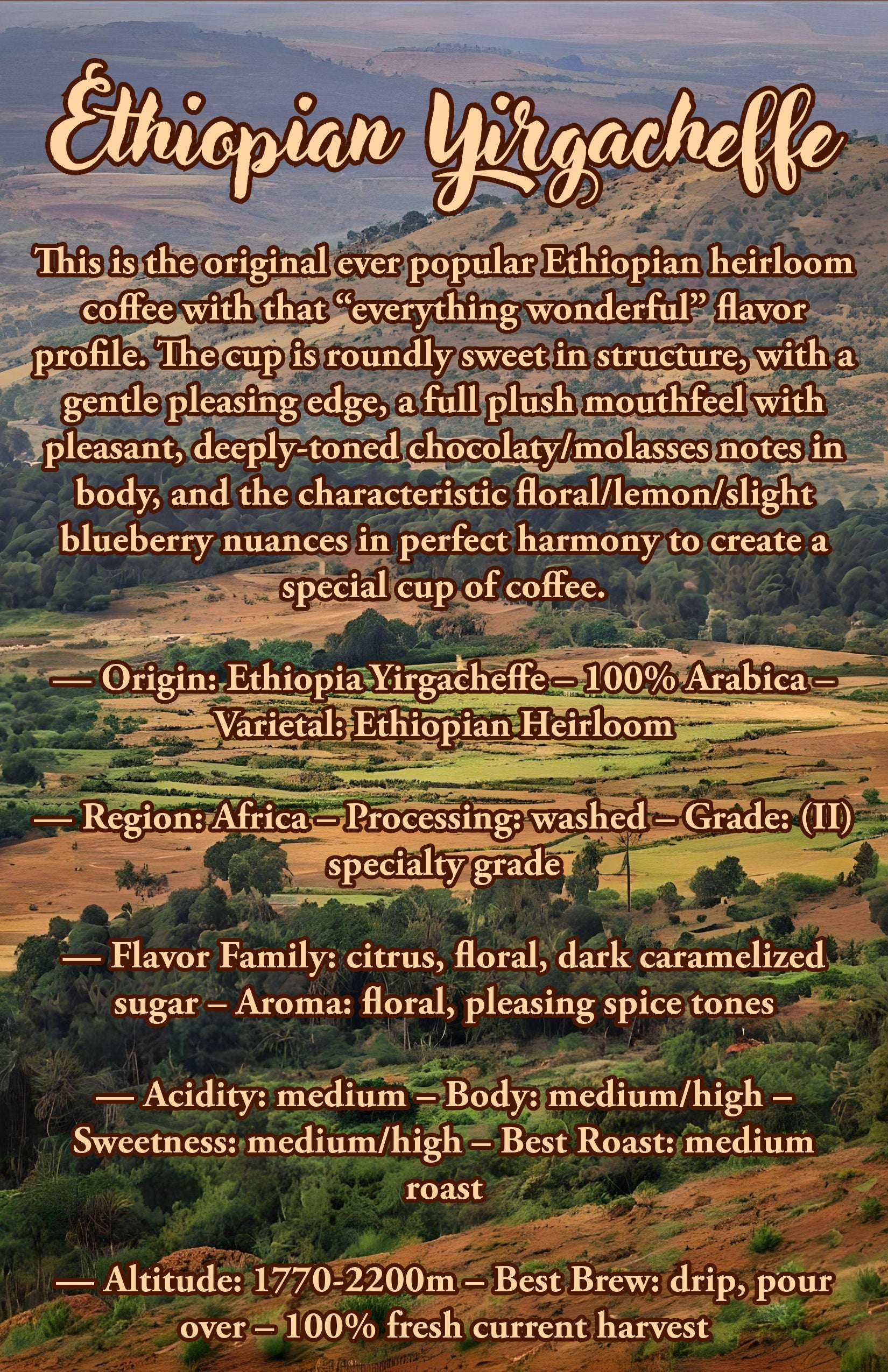 — Origin: Ethiopia Yirgacheffe – 100% Arabica – Varietal: Ethiopian Heirloom