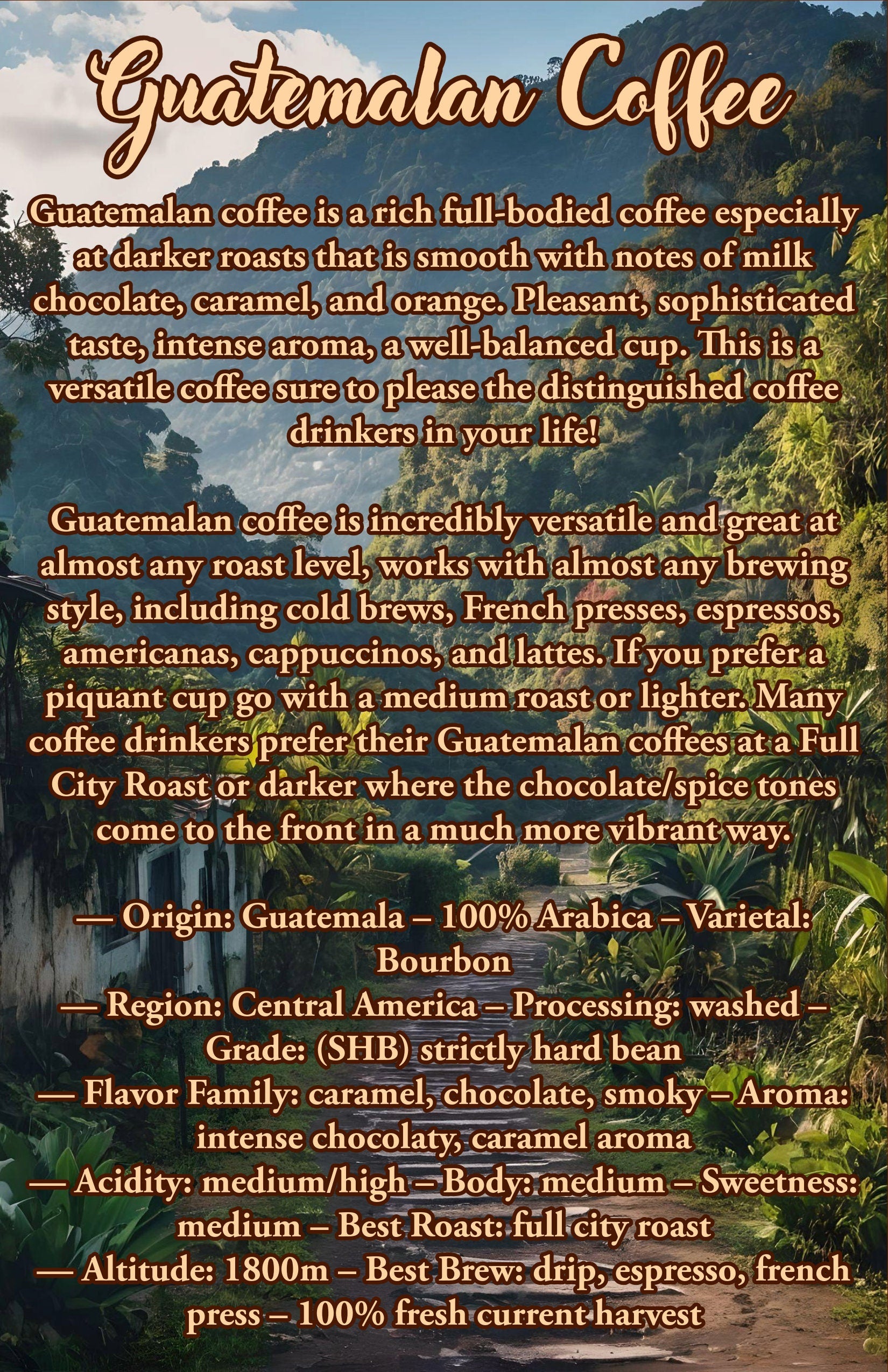 Guatemalan coffee is a rich full-bodied coffee especially at darker roasts that is smooth with notes of milk chocolate, caramel, and orange. Pleasant, sophisticated taste, intense aroma, a well-balanced cup. This is a versatile coffee sure to please the distinguished coffee drinkers in your life!