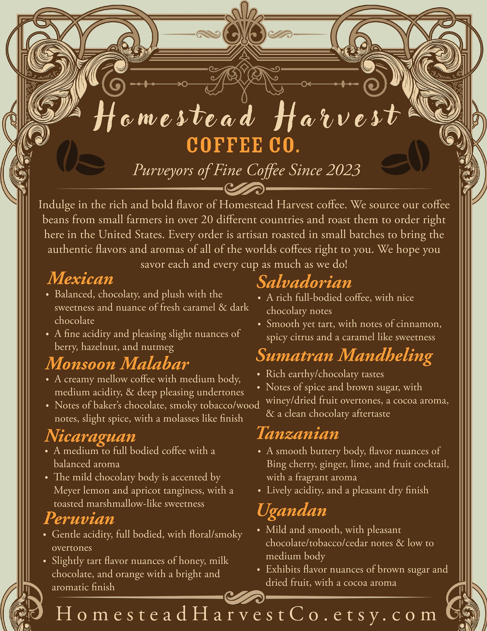 Indulge in the rich and bold flavor of Homestead Harvest Mexican 100% Arabica coffee beans. Our whole beans are artisan roasted in small batches to bring the authentic flavor of Mexican coffee right to your cup.