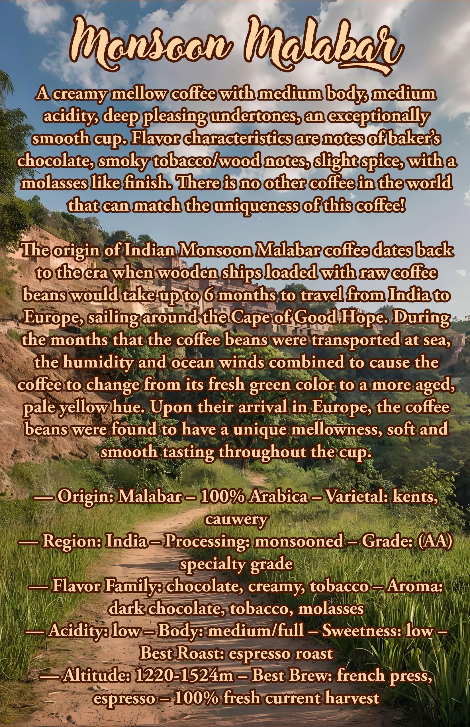 The origin of Indian Monsoon Malabar coffee dates back to the era when wooden ships loaded with raw coffee beans would take up to 6 months to travel from India to Europe, sailing around the Cape of Good Hope. During the months that the coffee beans were transported at sea, the humidity and ocean winds combined to cause the coffee to change from its fresh green color to a more aged, pale yellow hue. Upon their arrival in Europe, the coffee beans were found to have a unique mellowness, soft and smooth tasting throughout the cup.