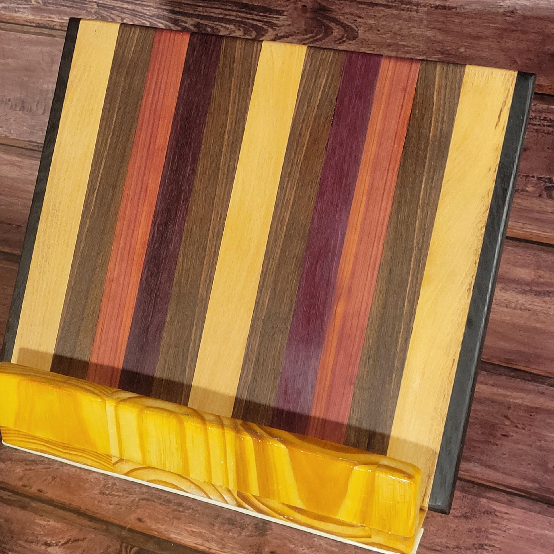 This stunning handcrafted cutting board is beautifully made with alternating stripes of exotic woods from all over the world, including African Padauk, Red Cedar, Curly Maple, Black Walnut, and Wenge. It will surely impress every guest in your kitchen when you pull this out! Each variety of wood has its own unique eye catching wood grain pattern and color which sets it apart from your typical cutting board. They come finished and ready for use, so no oiling required.