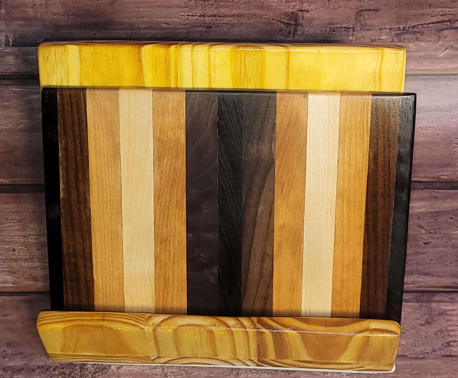This stunning handcrafted cutting board is beautifully made with alternating stripes of exotic and domestic hardwoods from all over the world, including Wenge, Black Walnut, Ash, and Maple. It will surely impress every guest in your kitchen when you pull this out! Each variety of wood has its own unique eye catching wood grain pattern and color which sets it apart from your typical cutting board. They come finished and ready for use, so no oiling required.
