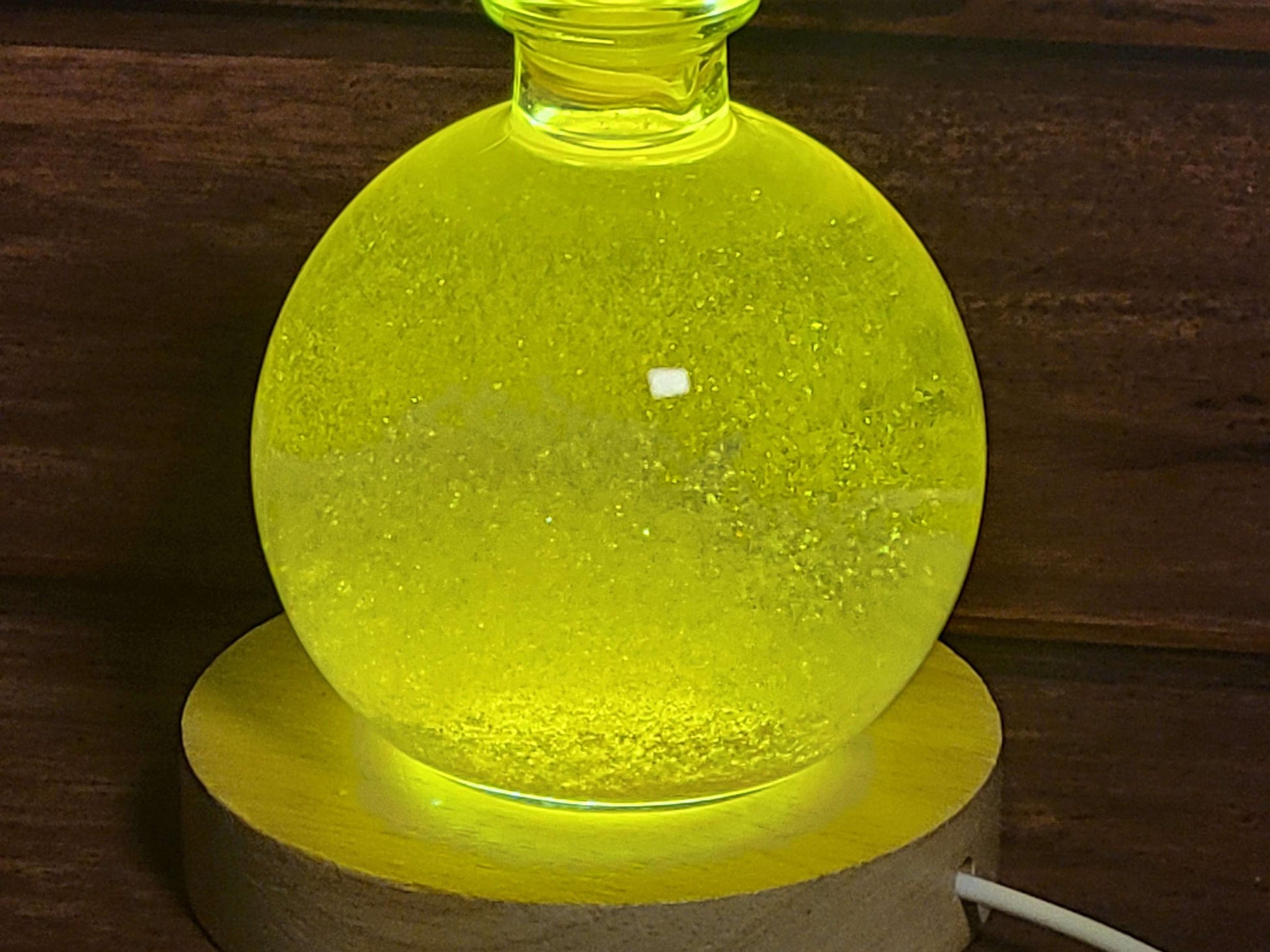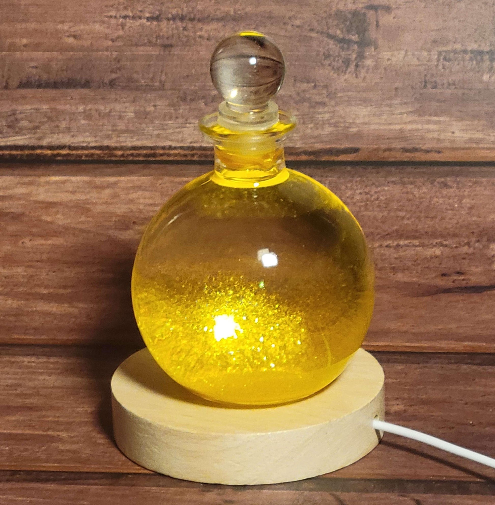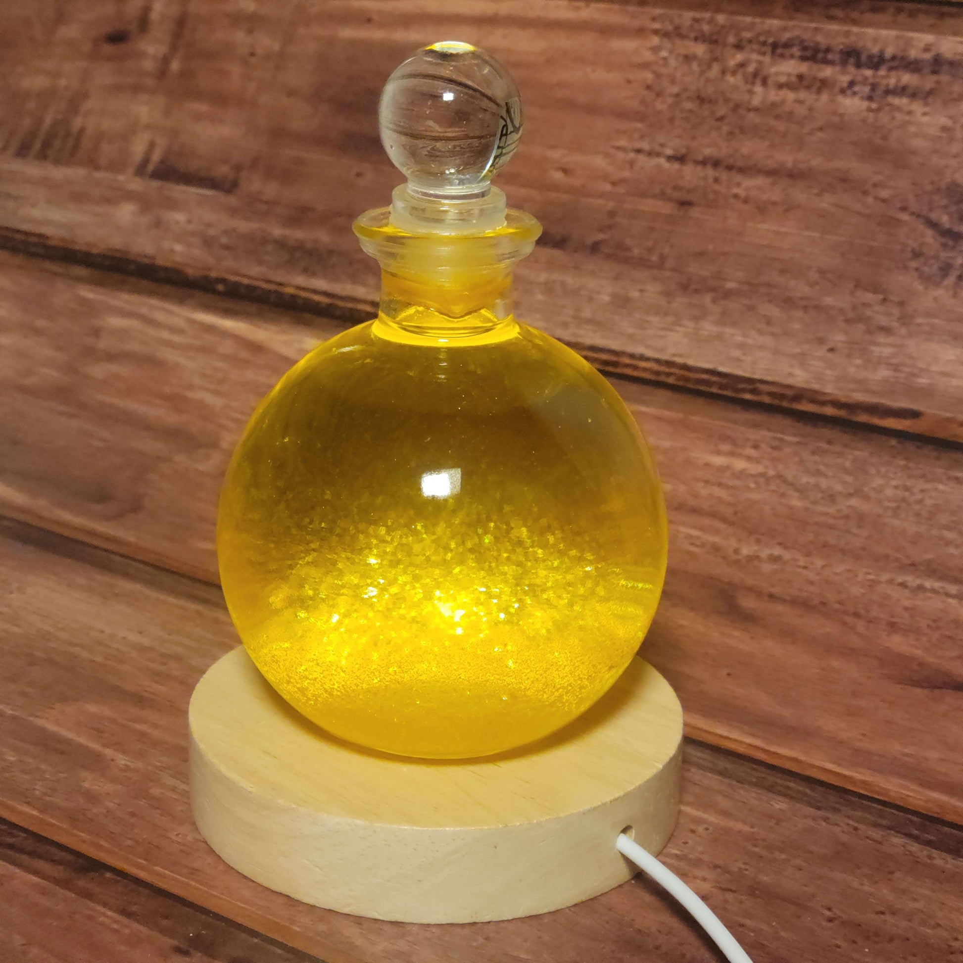 This "Golden Rain" snow globe contains a sea of beautiful golden flakes that resemble plates of gold. It makes a fascinating and unique chemistry demonstration, decorative display, or gift! When turned over all of the golden flakes rain down in a brilliant cascade that is sure to impress the beholder time and time again. It comes with a round wooden display with a built in LED for illuminating the globe, taking the visual display to the next level! The LED display plugs into any USB port or USB wall adapter.