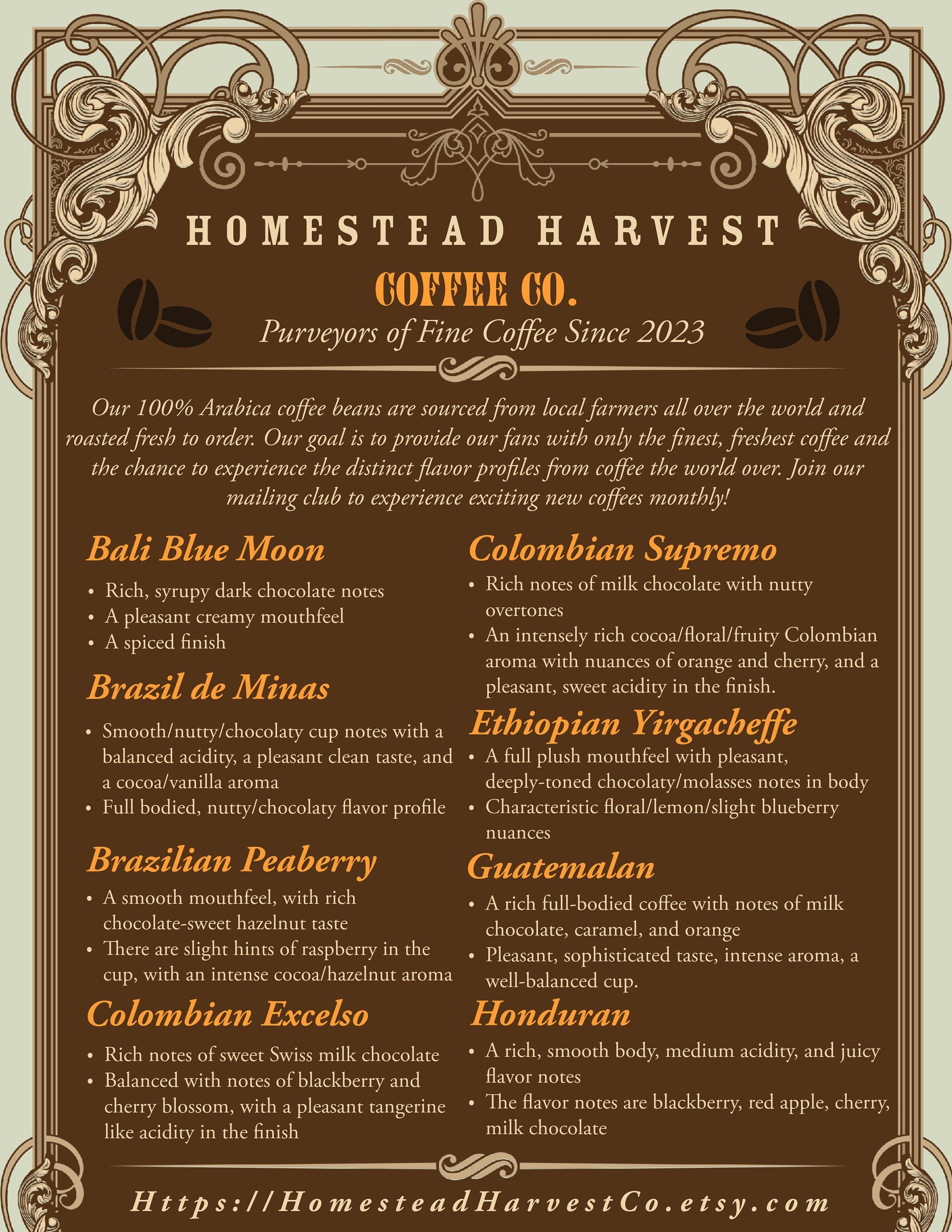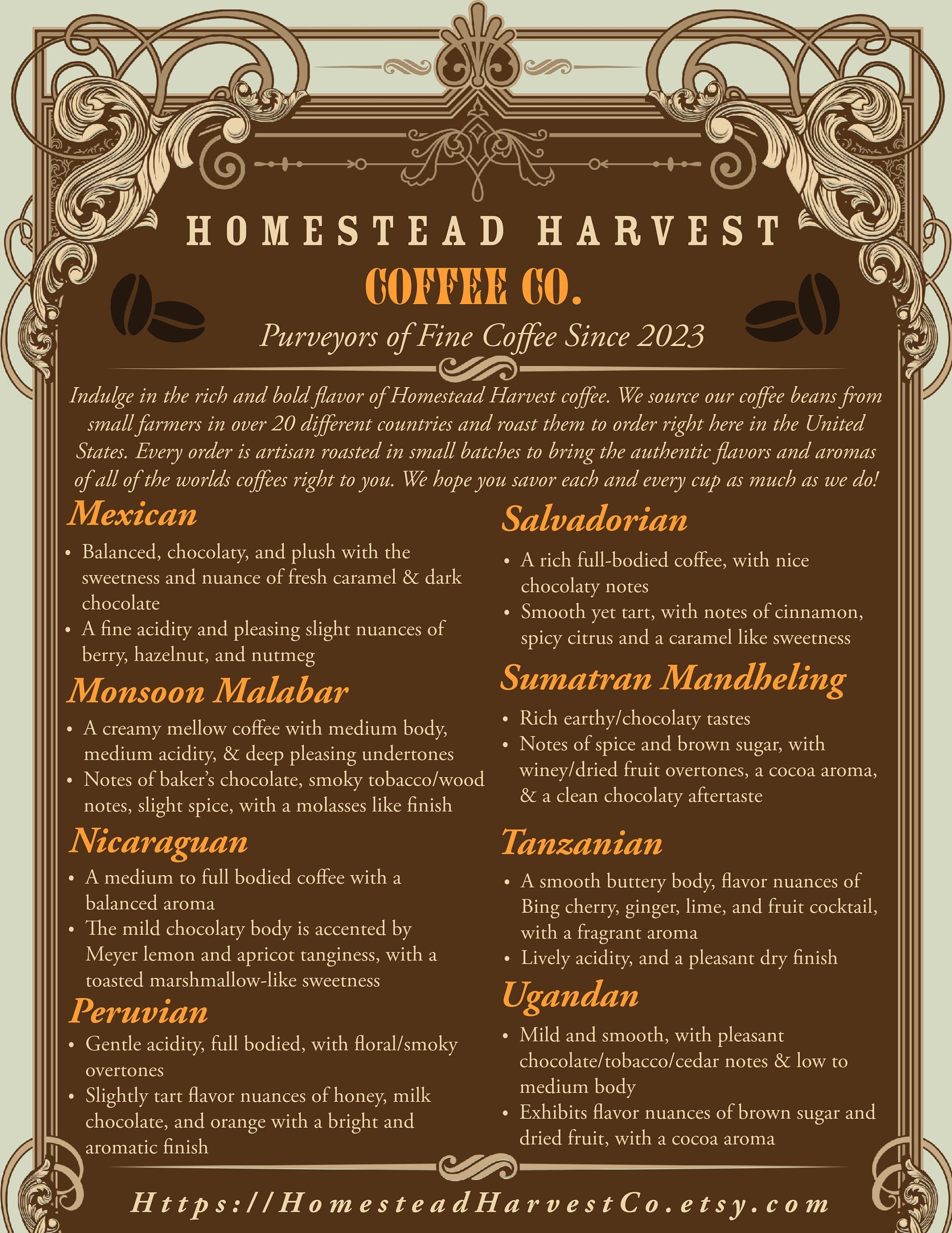 We now offer all natural Mocha & French Vanilla flavoring options for your ground coffee order. Give it a try today! Check back in regularly for all new flavoring options!